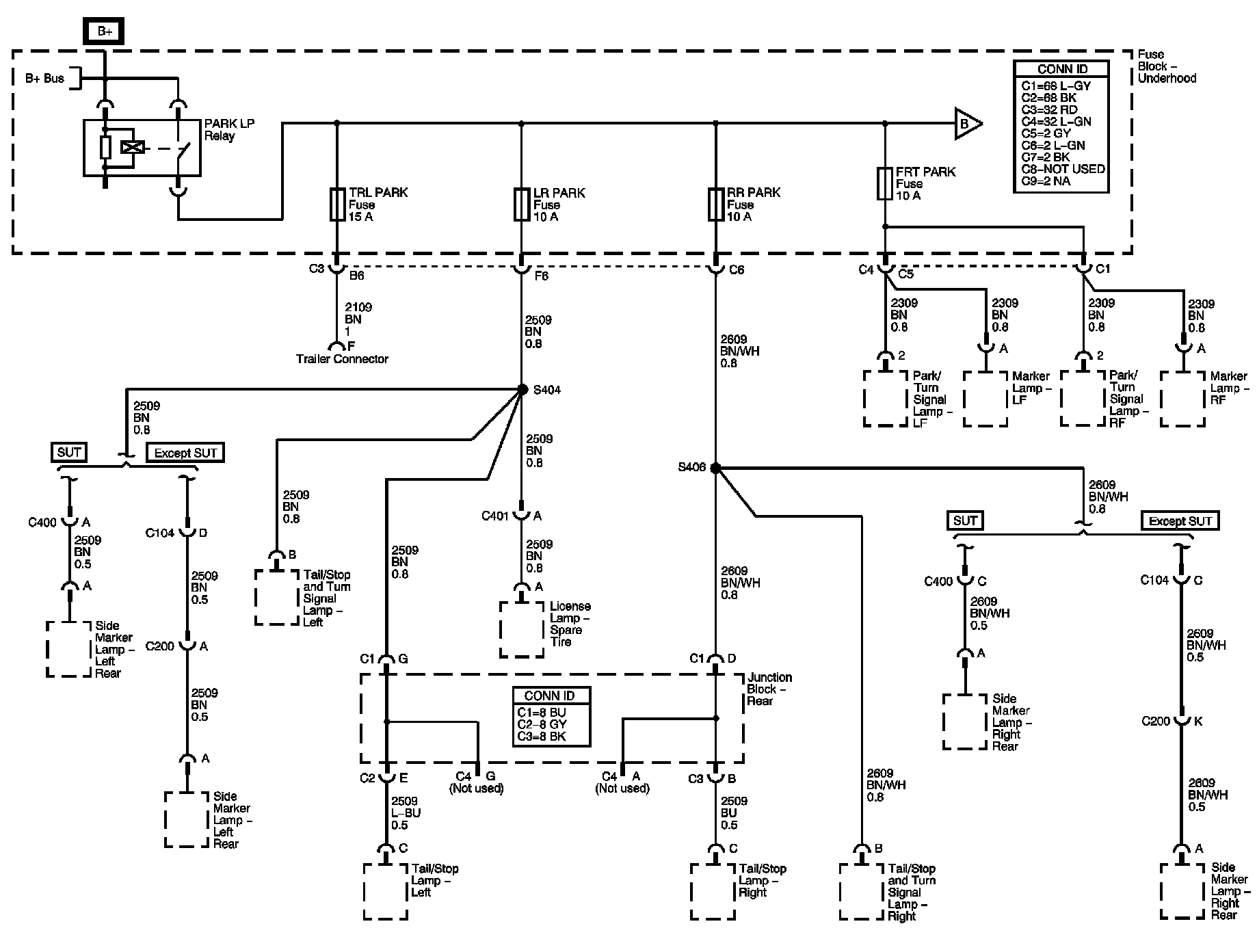FRT PARK, LR PARK, RR PARK, and TRL PARK Fuses