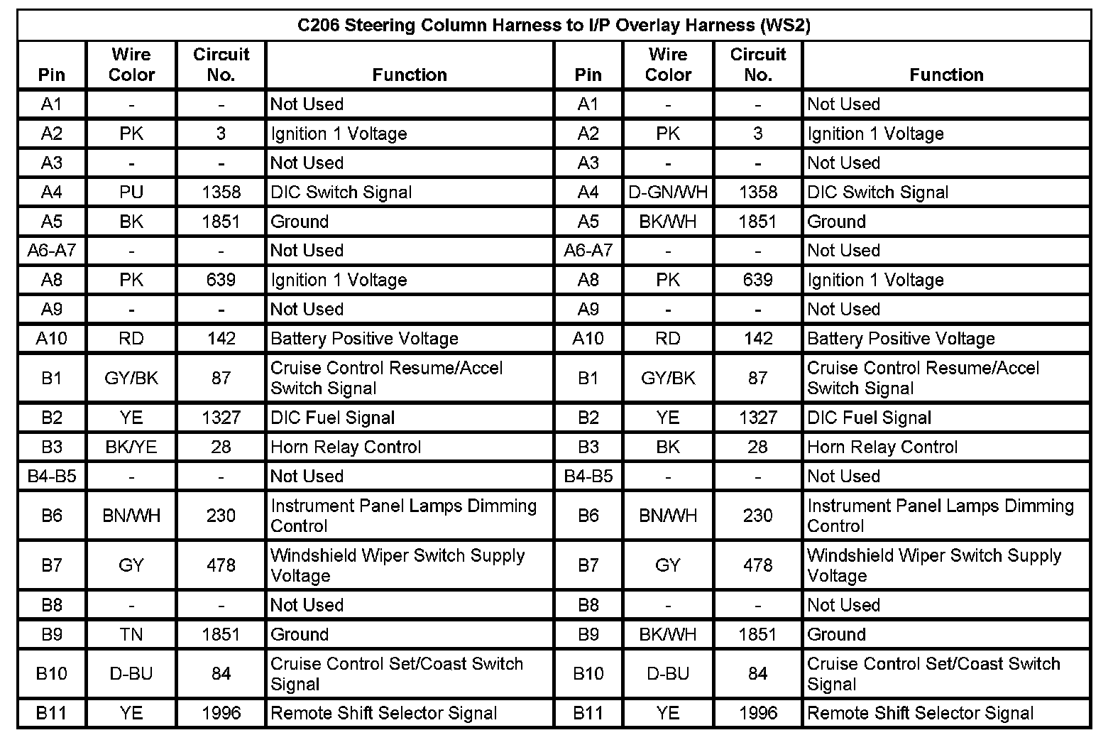 C206 Steering Column Harness To I/P Overlay Harness (WS2) (Pin A1 To B11):