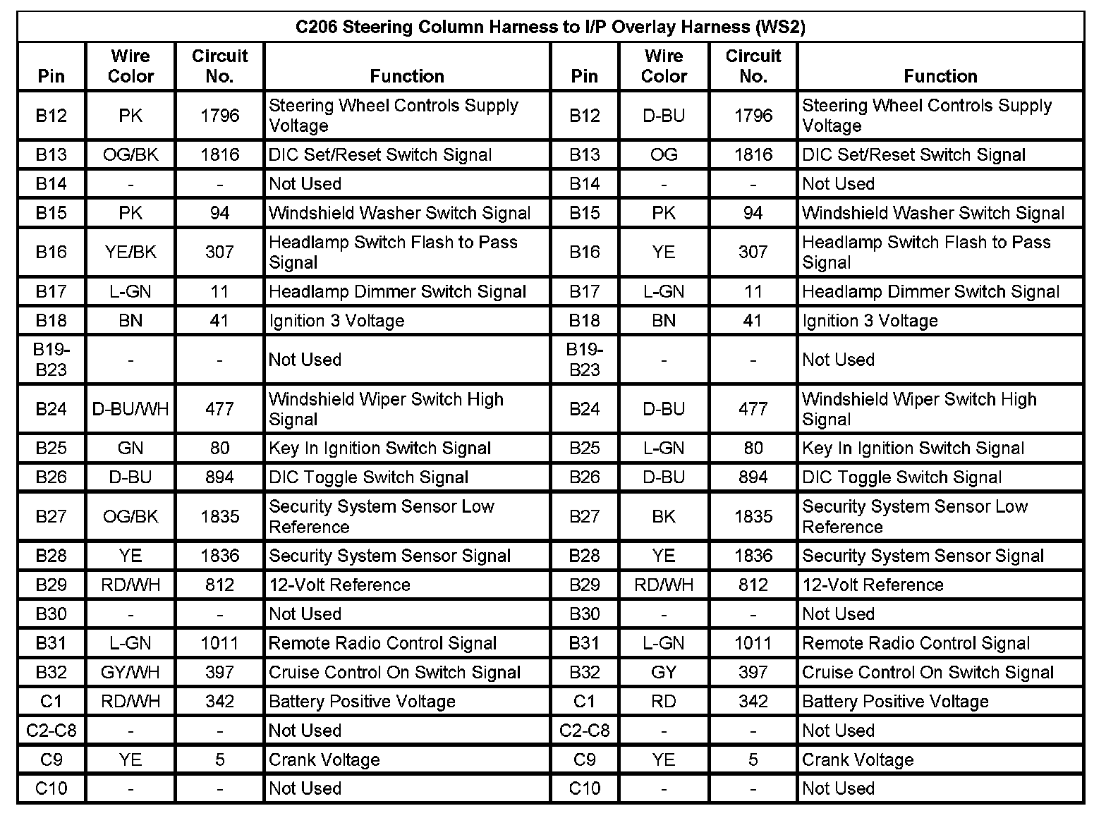 C206 Steering Column Harness To I/P Overlay Harness (WS2) (Pin B12 To C10):