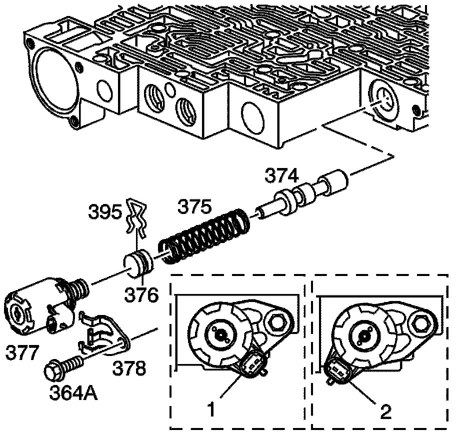 If clutch debris is found, it is also very important to inspect the Pressure Control (PC) solenoid valve (377) fluid screens. Clean or replace the PC solenoid (377) as necessary. It is also important to flush and flow check the transmission oil cooler using J45096. Refer to SI Automatic Transmission Oil Cooler Flushing and Flow Test for the procedure.