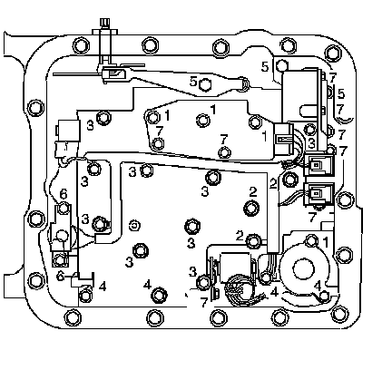 15. Place the tab between the valve body and the pressure switch in the location shown (2). Press the harness into position on the valve body bolt bosses (1, 3).