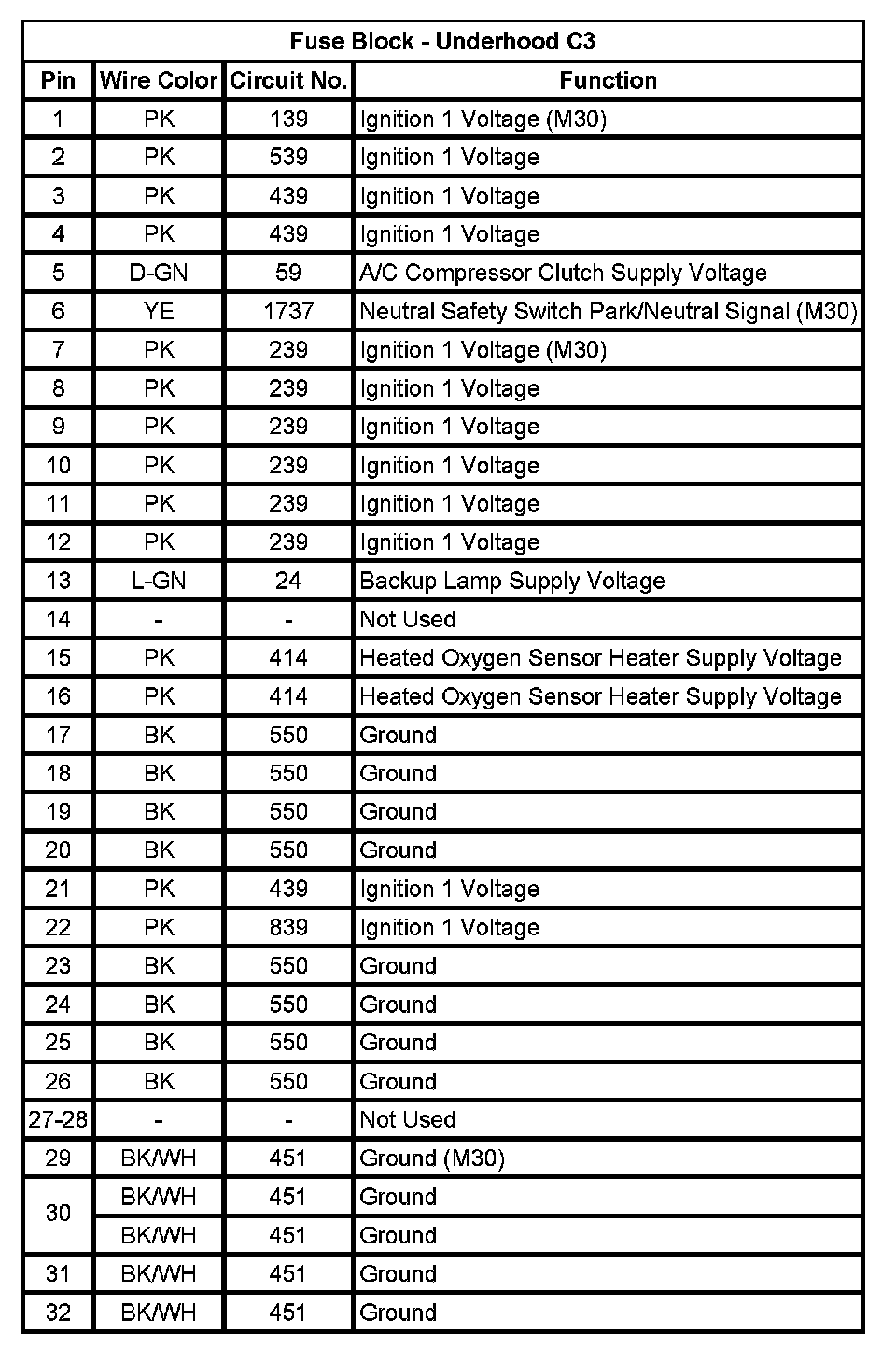 Fuse Block - Underhood C1 (Pin 16 To 47):