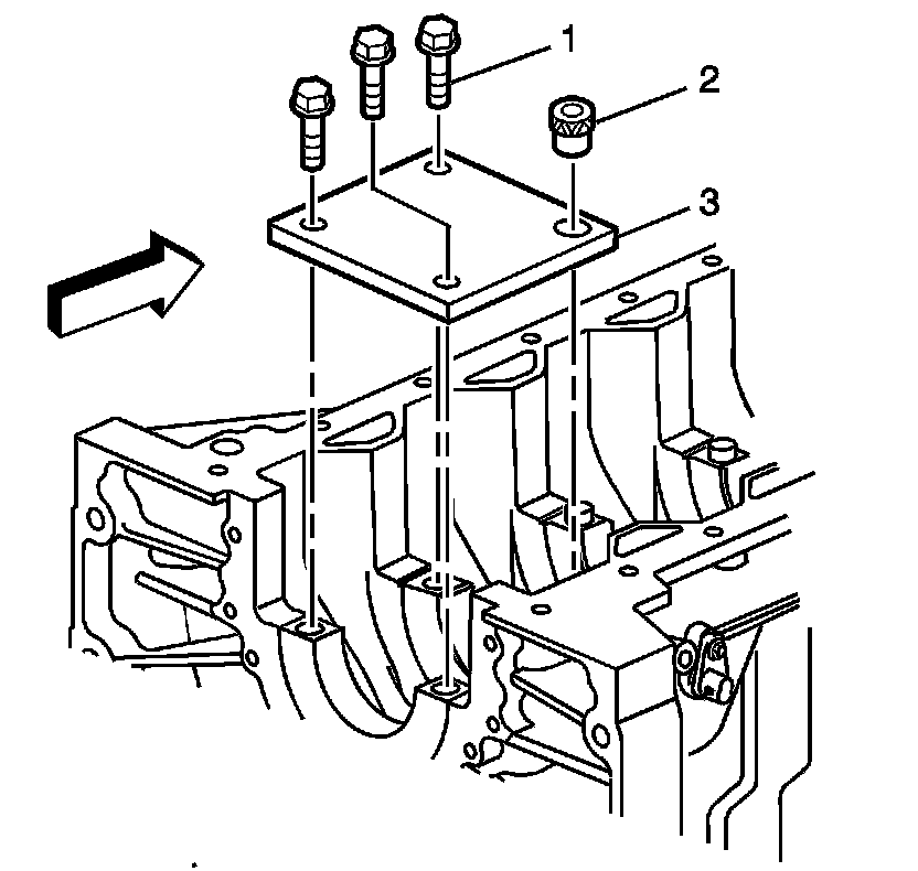 1. Position the fixture plate (3) with the bushing (2), installed over the crankshaft main cap bolt hole to be repaired.