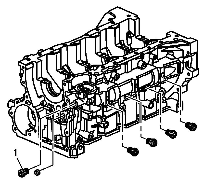 ^ Tighten the front (1) engine block oil gallery plug to 80 N.m (40 lb ft).