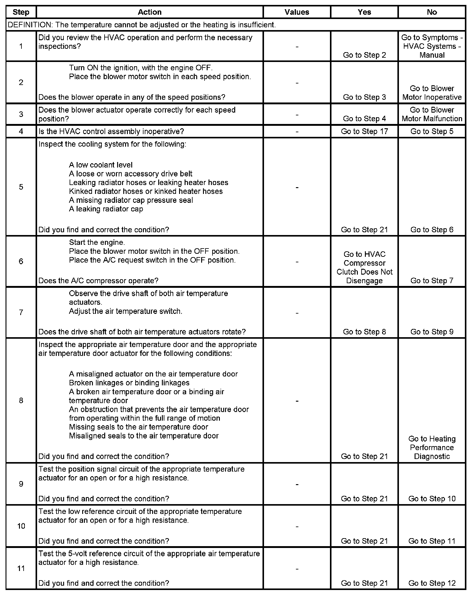 The numbers below refer to the step numbers on the diagnostic table.