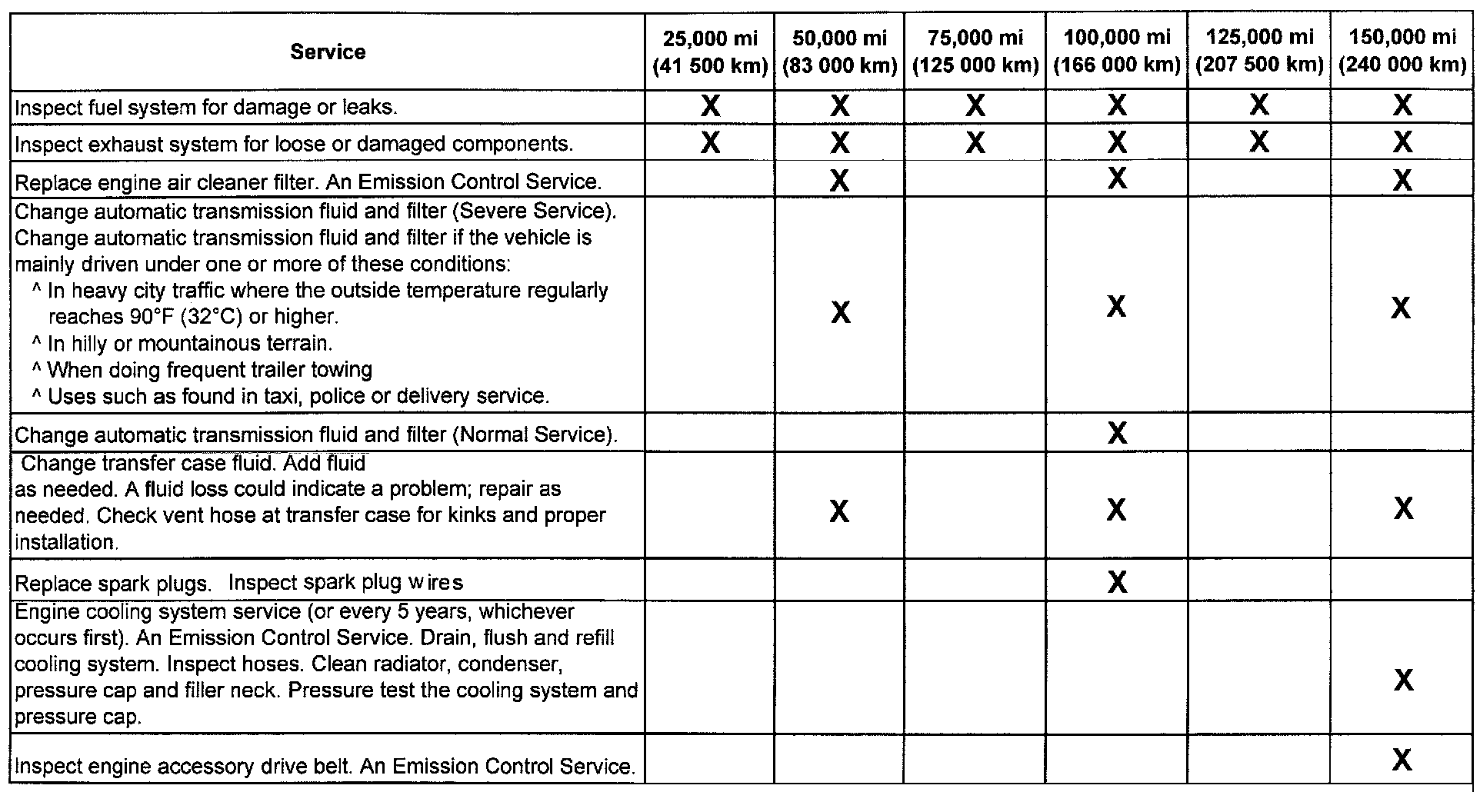(Maintenance I or Maintenance II) after the indicated kilometers (miles) shown for each item.