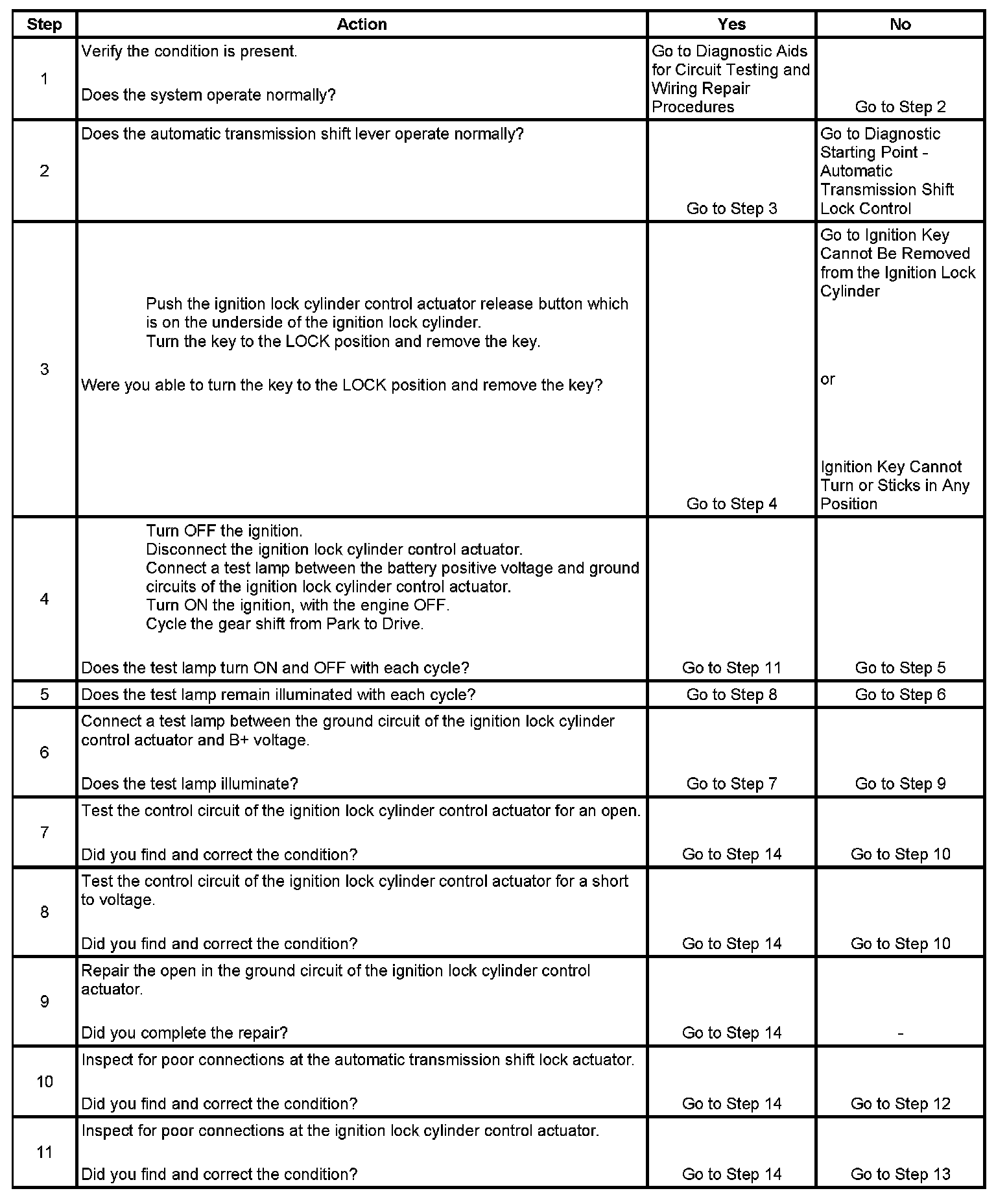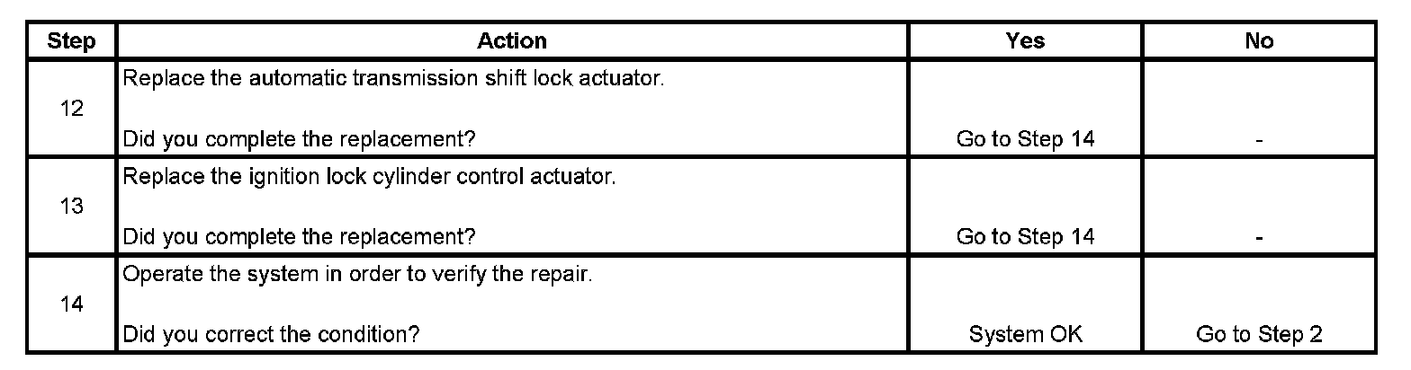 If the vehicle is equipped with a floor mounted console gearshift, an ignition lock cylinder control actuator system is used in the steering column. The purpose of the system is to prevent the ignition lock cylinder from being turned to the lock position while the transmission is in gear, this also prevents the steering wheel from being locked. The system consists of an ignition lock cylinder actuator and a park position switch. The actuator contains a pin that is spring loaded out, to prevent the ignition lock cylinder from being turned to the lock position when the gearshift is not in Park. The park position switch is located in the floor mounted gearshift assembly, as part of the automatic transmission shift lock control switch. The switch is closed with the gearshift in PARK, and open in all other positions