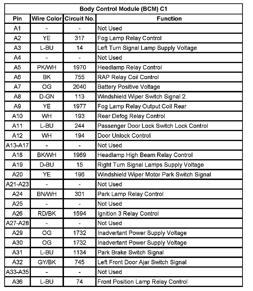 Body Control Module (BCM) C1 (Pin A1 To A36):
