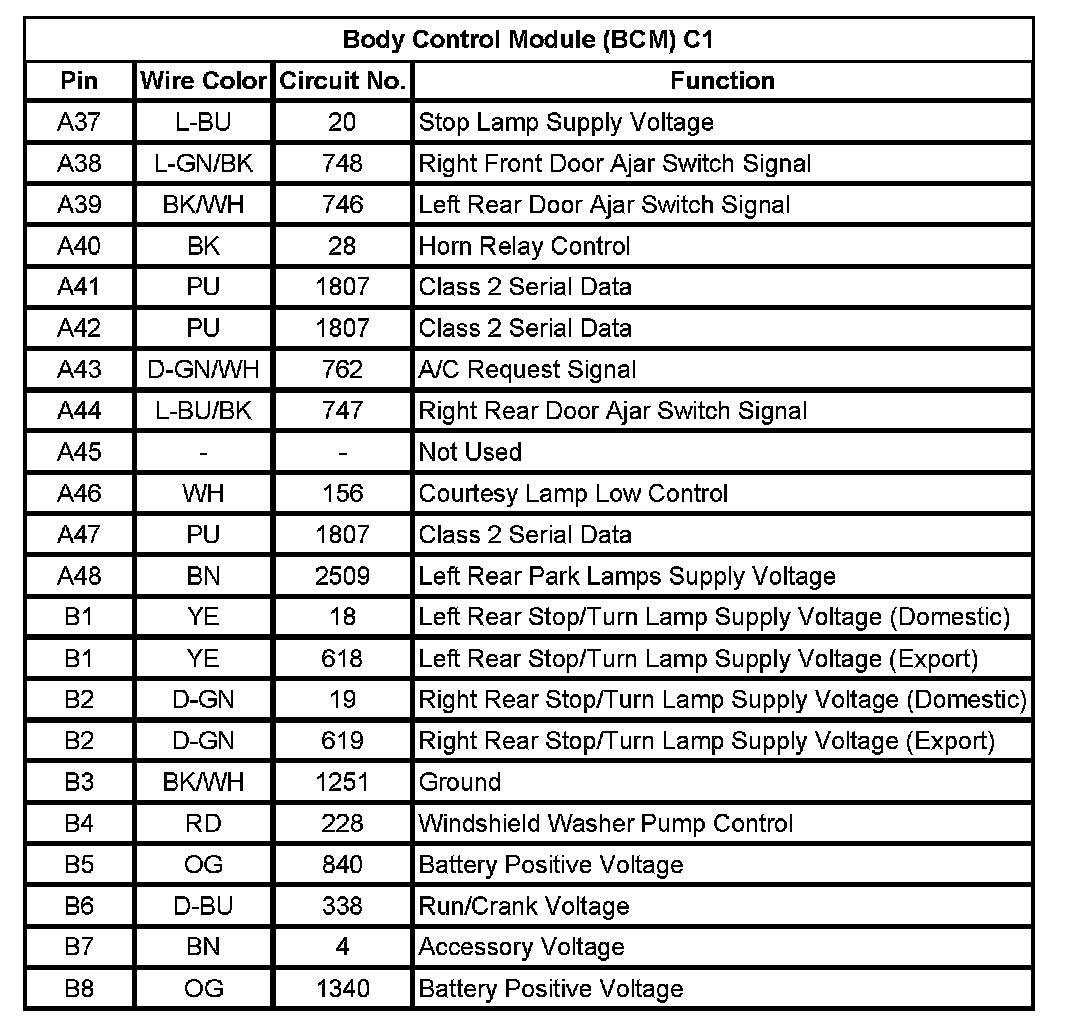 Body Control Module (BCM) C1 (Pin A37 To B8):