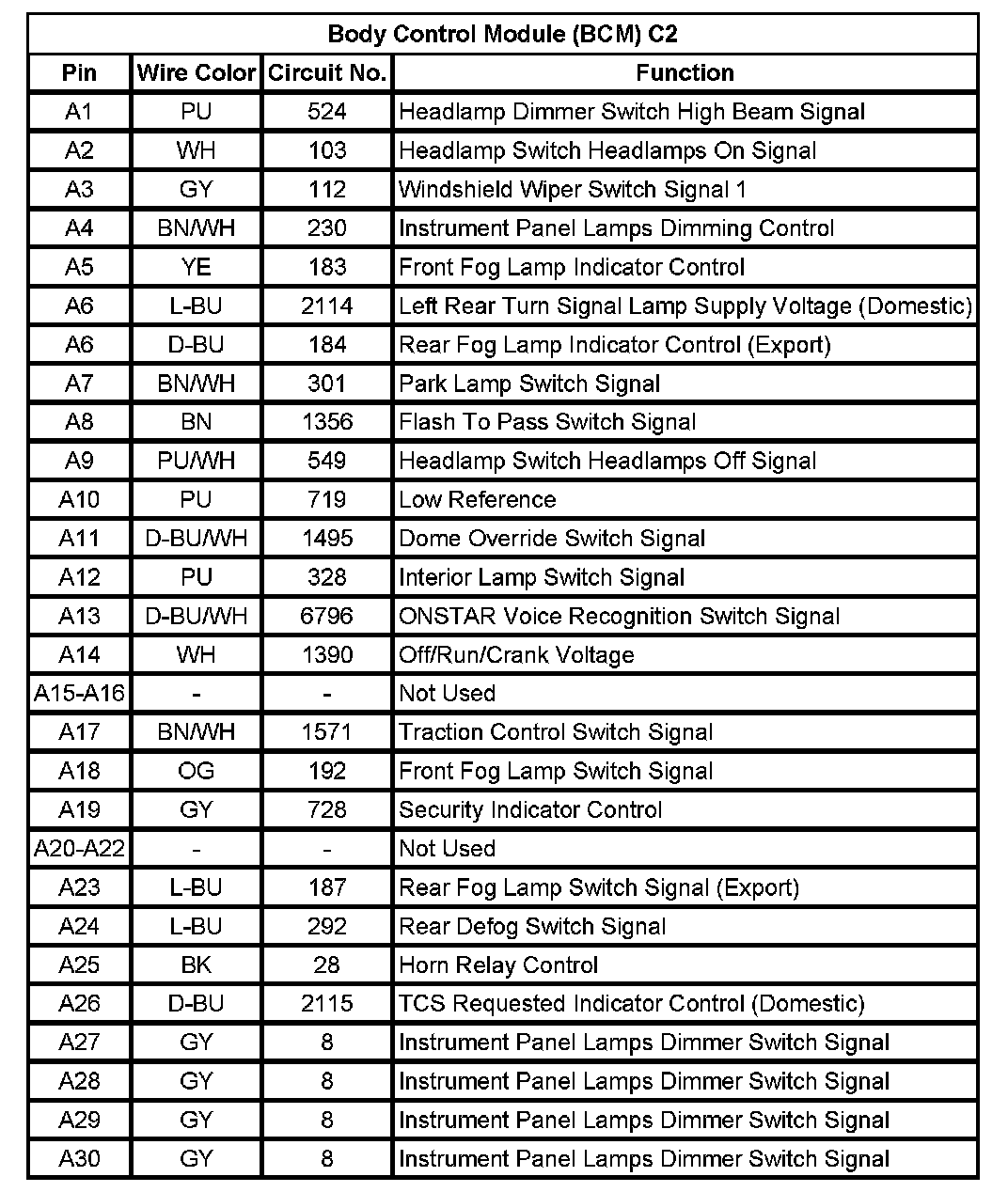 Body Control Module (BCM) C2 (Pin A1 To A30):