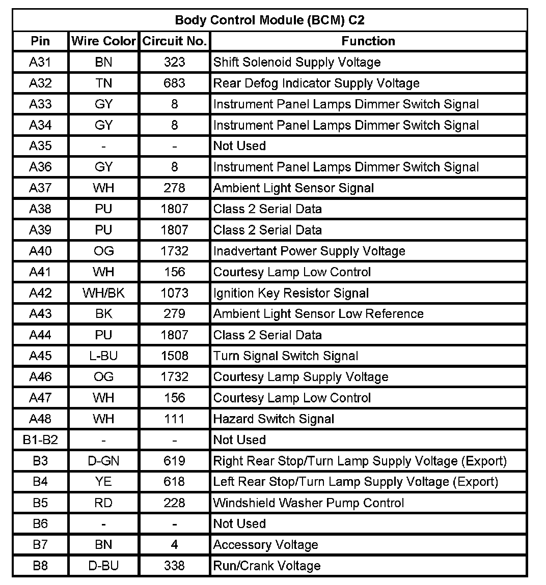Body Control Module (BCM) C2 (Pin A31 To B8):