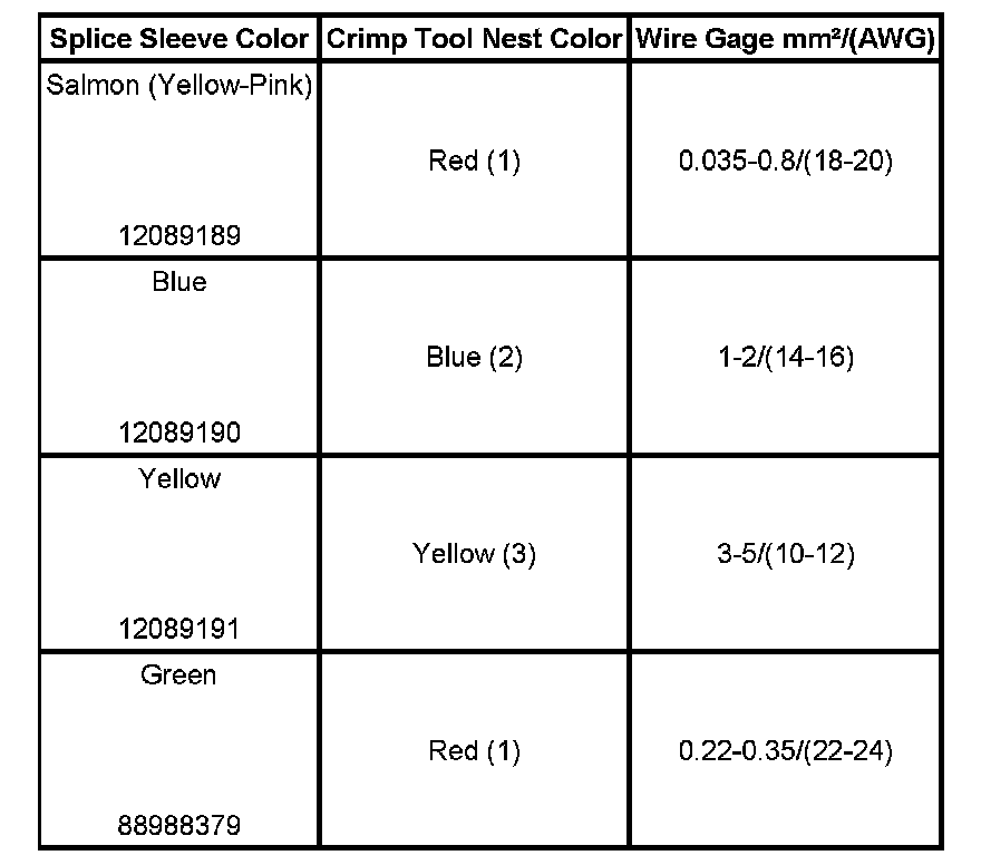 6. Select the proper DuraSeal splice sleeve according to the wire size. Refer to the above table at the beginning of the repair procedure for the color coding of the DuraSeal splice sleeves and the crimp tool nests.