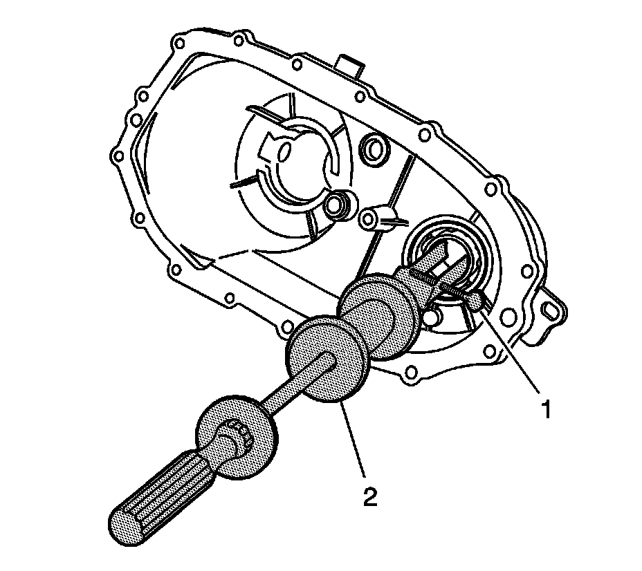 62. Using the J 29369-1 (1) and the J 23907 (2), remove the front output shaft rear bearing from the rear case.