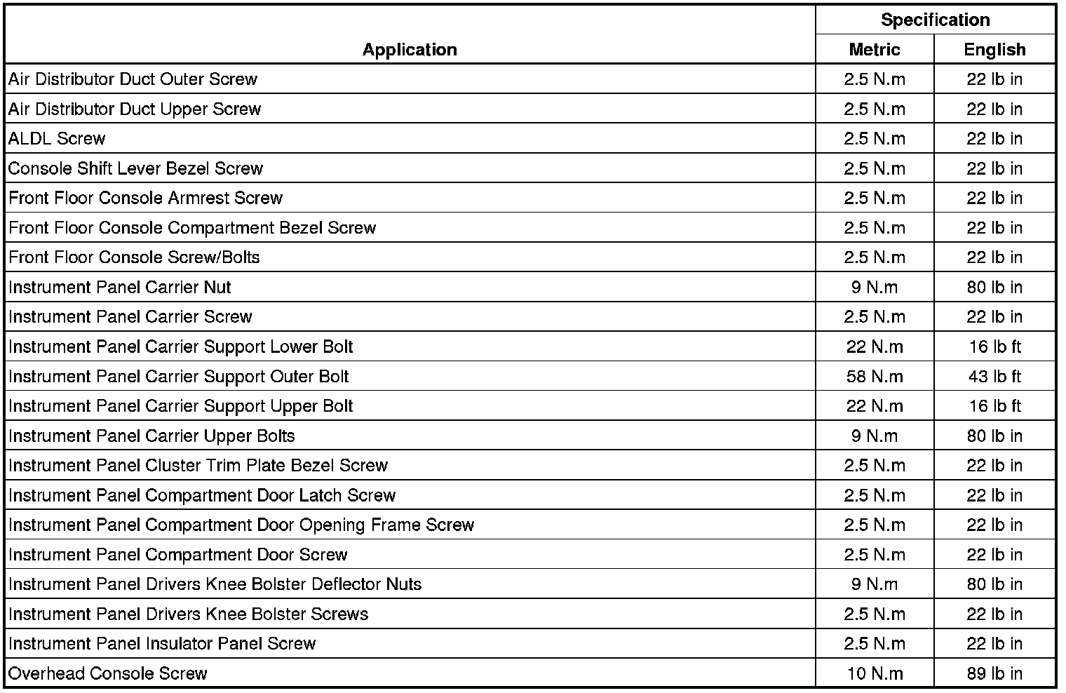 Instrument Panel and Console Trim - Fastener Tightening Specifications