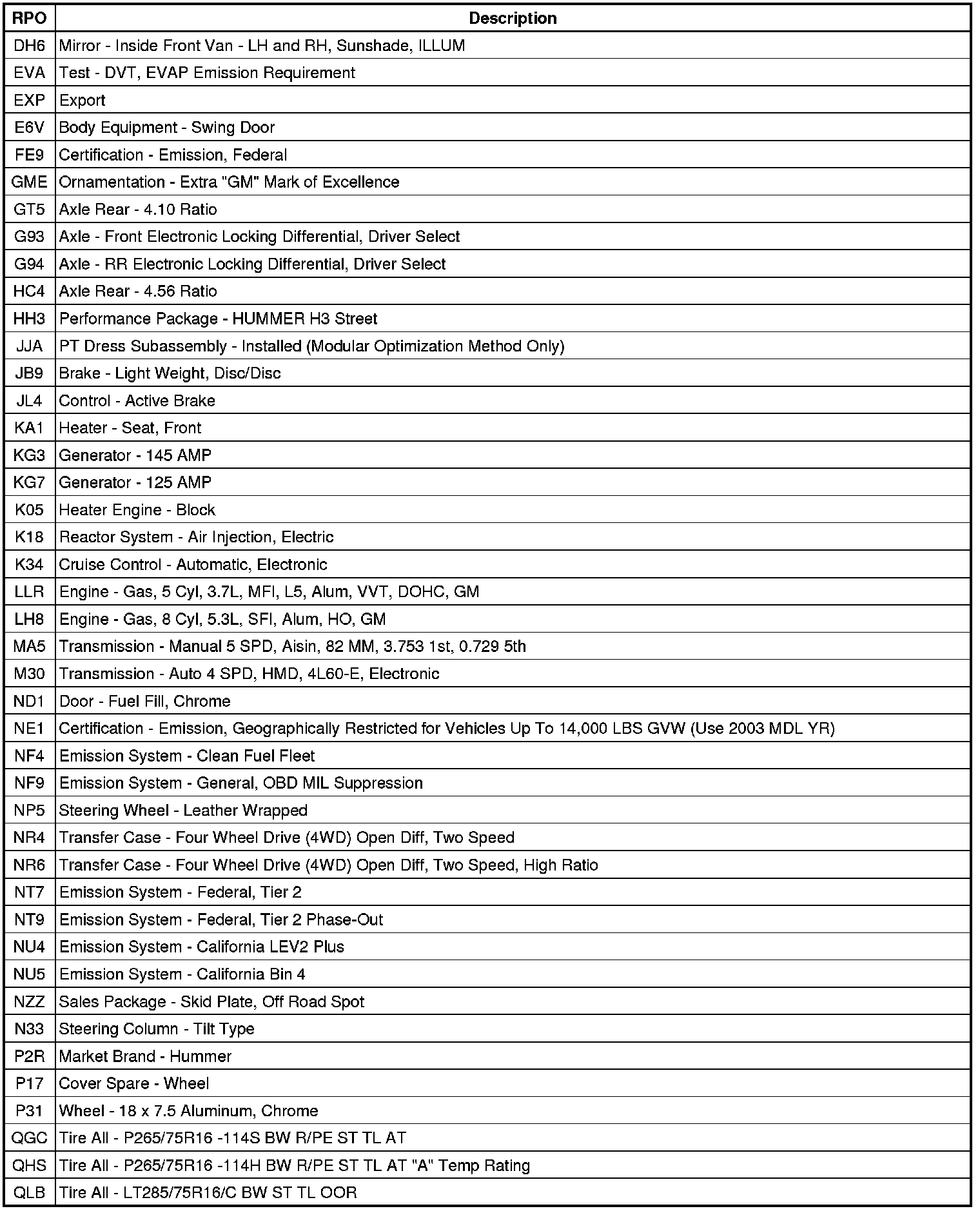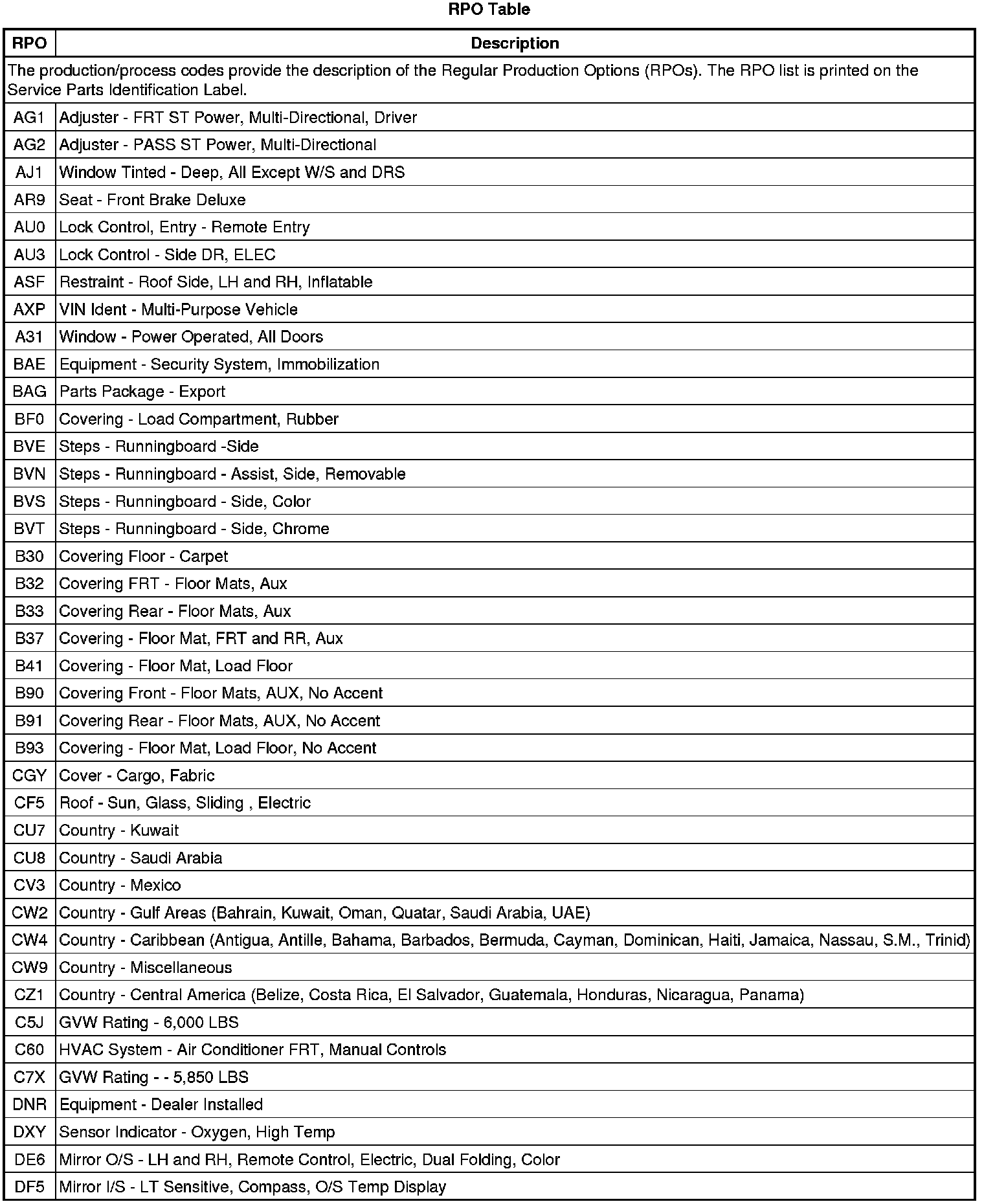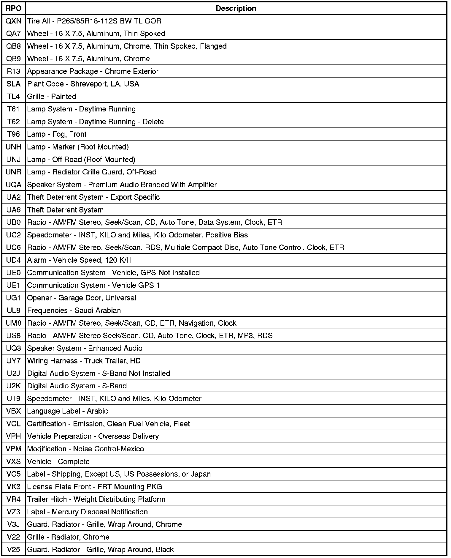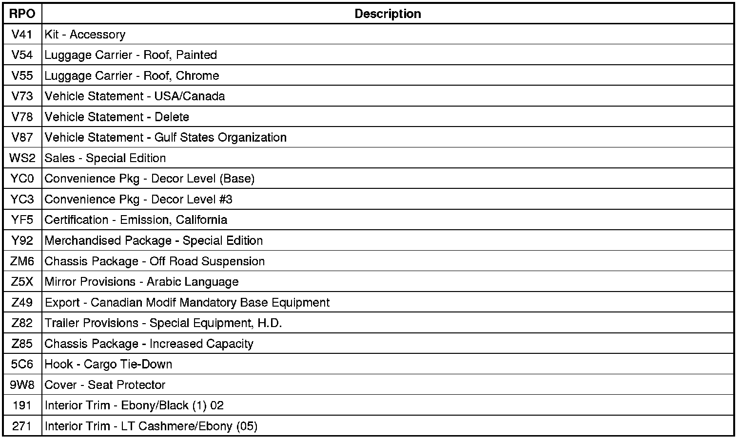 RPO Code List