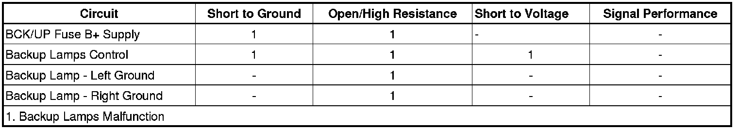 • If both backup lamps are not illuminated, test the backup lamp control circuit for a short to ground or an open/high resistance.