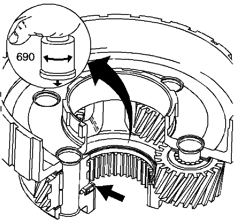 1. Without touching the pinion gears, place a bushing or an output shaft sleeve (690) onto the bearing race, and turn it with the palm of your hand.