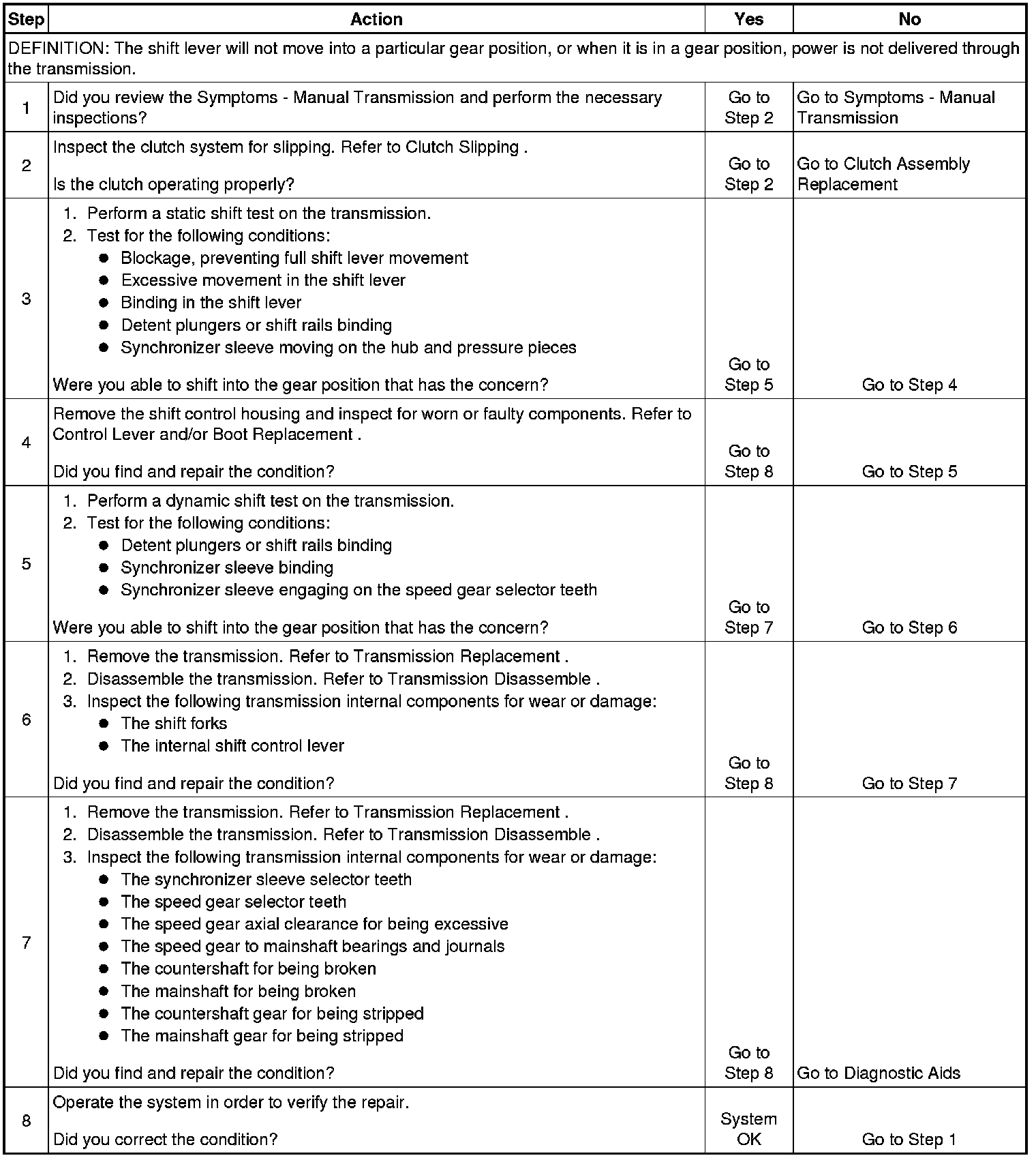 3. A static shift test is performed by shifting into all gears with the engine not operating. While performing the test, you should note how the shift lever movement feels. Also, feel for the shift rails moving freely, the detent plungers operating when coming out of a gear and going in the next gear, and the synchronizer sleeve movement.
