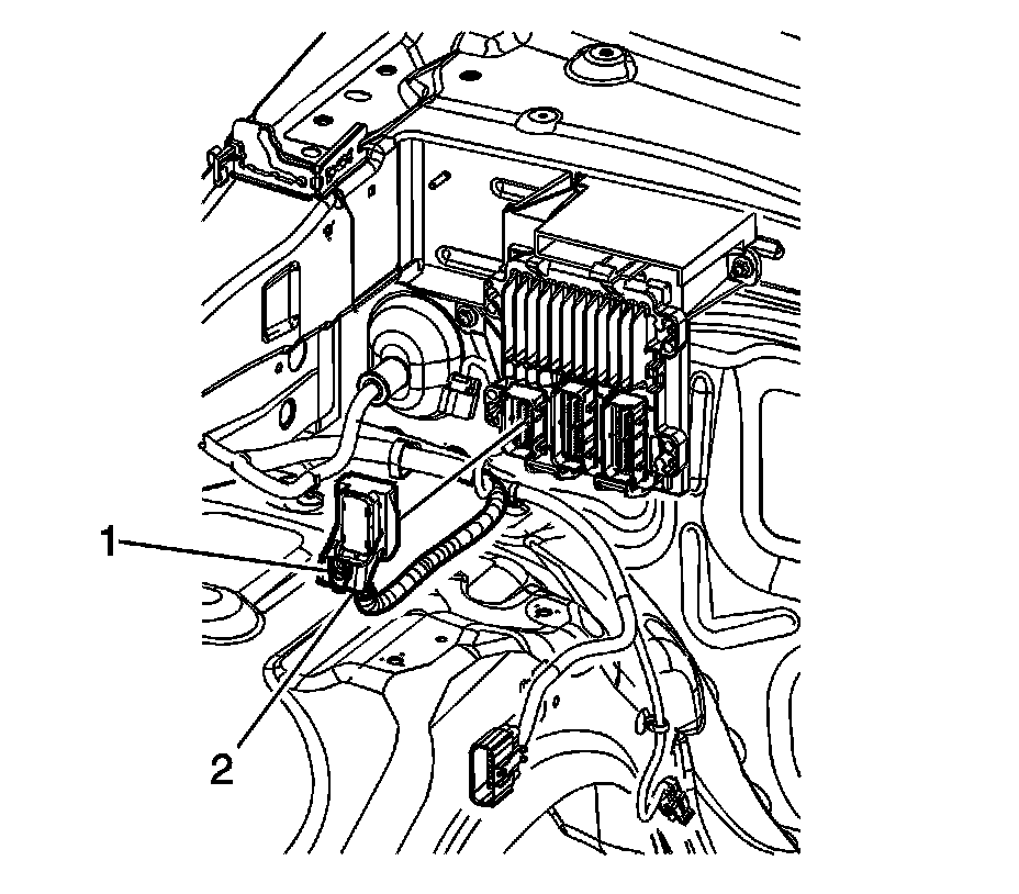 1. Set the bottom of the ECM (1) into the bracket, and push the top of the ECM against the bracket. Ensure that the tabs (2) secure the ECM (1).