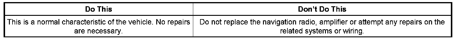 The vehicle will not exhibit this condition if it is started rapidly with no pause from the Off to the crank position and the doors are closed with the seat belt fastened (so that the chimes are not active when starting). The thump noise is a characteristic of the Navigation Radio system analog processor. This architecture has a regulated 8.5 volt supply in the mixer circuit to bring in the "voice prompt signal" and the "chime" signal to a common audio output. When the regulated voltage output dips, a transient on the audio output may lead to the thump noise.