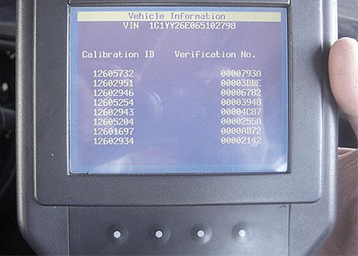 8. Take a CLEAR digital picture of the Tech 2(R) Vehicle Information screen showing the engine Calibration IDs and Verification Numbers as shown above. Retain the printout information and the Tech 2(R) screen photograph with the repair order.