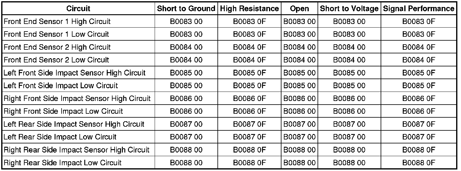 The inflatable restraint front end sensor utilizes a unidirectional 2-wire circuit. The front end sensor modulates current on the interface to send ID, state of health, and deployment commands to the inflatable restraint sensing and diagnostic module (SDM). The SDM serves as a power source and a ground for the front end sensor. When the ignition is turned ON and input power from the SDM is first detected, the front end sensor responds by performing internal diagnostics and sending an ID to the SDM. The SDM considers the ID to be valid if the response time is less than 5 seconds. The front end sensor continually communicates status messages to the SDM, which determines if a fault is present in the front end sensor circuit. When a fault is detected, the SDM may reset the front end sensor up to 2 times by removing and reapplying power to it. If the fault is still present, the SDM will set a DTC.