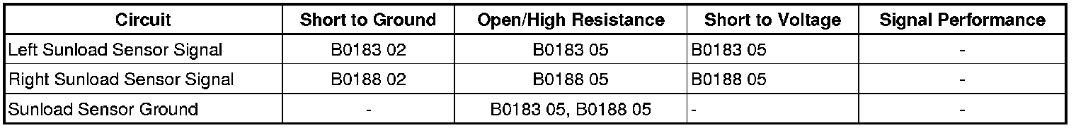 The following DTCs are for the left and right sunload sensors.
