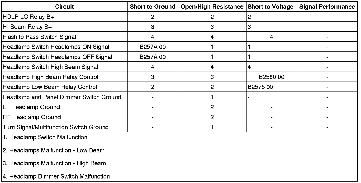 * When DTC B257A 00 is present on the headlamp switch headlamps ON signal circuit, the low beam headlamps are always ON. The BCM disregards all headlamp switch inputs.