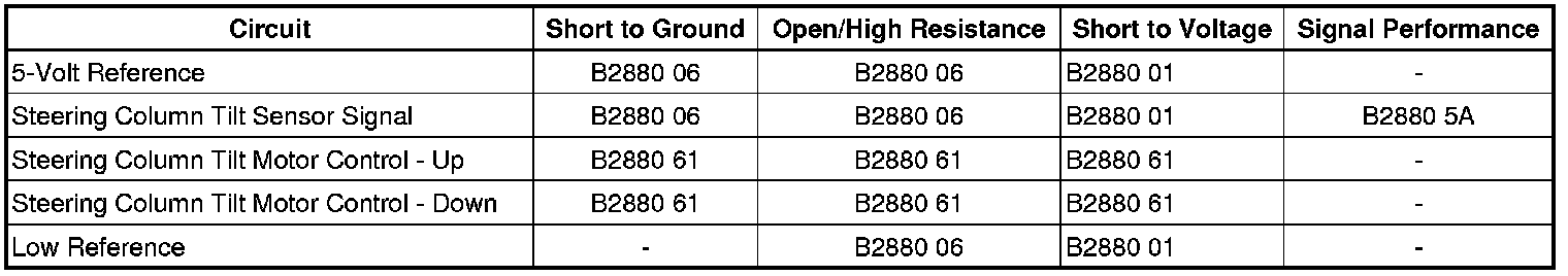 The steering column tilt sensor signal voltage is less than 0.2 volt for more than 2 seconds.