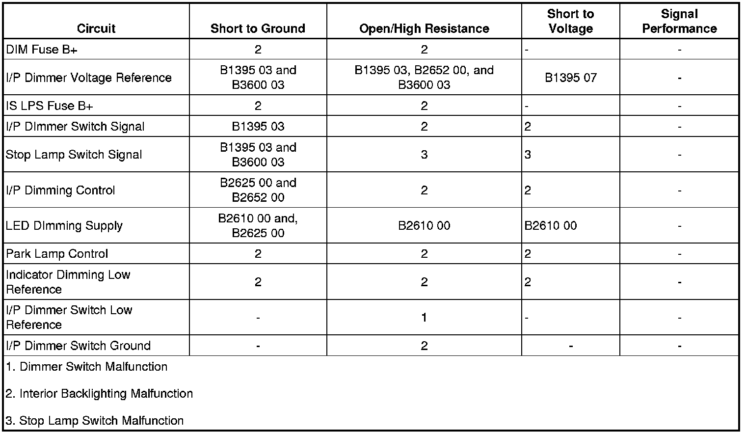 The instrument panel (I/P) lamp dimmer switch is used to increase and decrease the brightness of the interior backlighting components. The I/P dimmer switch provides a voltage signal that will increase as the brightness of the lights are increased and decrease as the brightness of the lights are decreased. The body control module (BCM) provides a low reference signal and a B+ voltage reference to the I/P dimmer switch. When the I/P dimmer switch is placed in the desired position, the dimmed voltage setting is applied from the I/P dimmer switch through the I/P dimmer switch signal circuit to the BCM. The BCM interprets the signal and applies the dimmed voltage to the I/P lamps supply voltage circuit and the interior backlighting components dim to the requested level. Ground for the I/P dimmer switch is provided at G200.