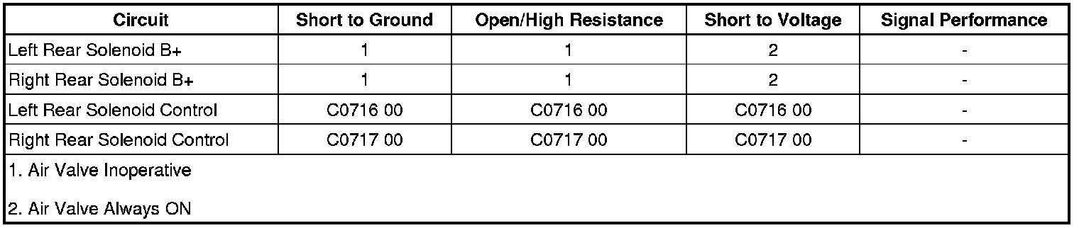 • If the test lamp does not illuminate, test the B+ circuits for a short to ground or an open/high resistance. If the circuit tests normal, test or replace the valve auto level control solenoid replacement.