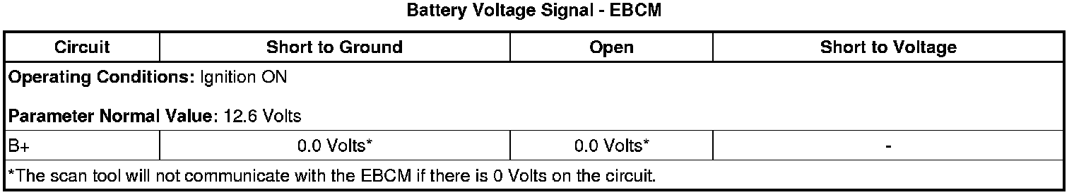2. Observe the scan tool EBCM Battery Voltage Signal parameter. The reading should be between 12.6 and 15.0 volts.