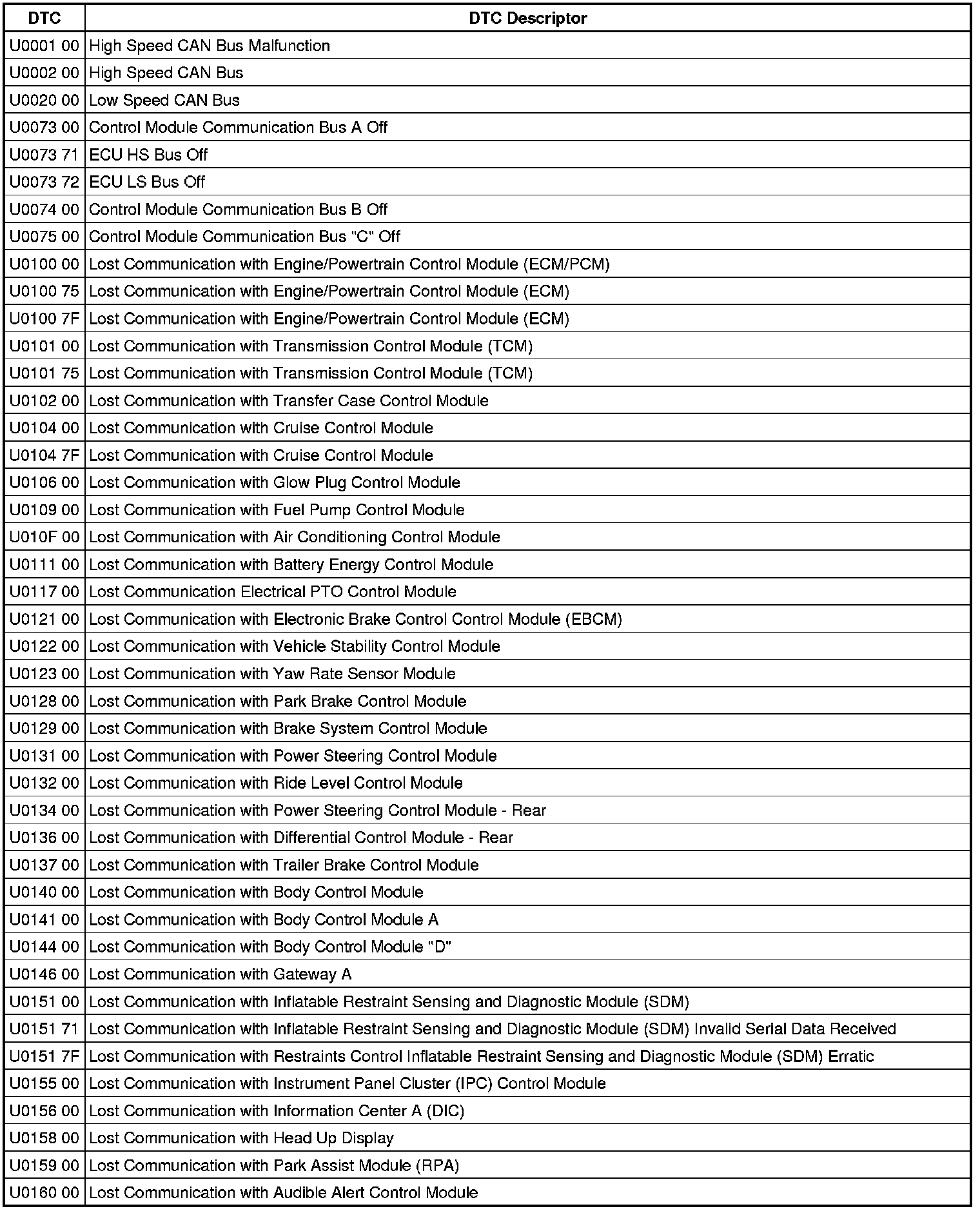 This list includes all Data Communications related U-code DTC's in alphanumeric order with descriptors for all modules. Not all DTC's listed will be applicable to all vehicles.