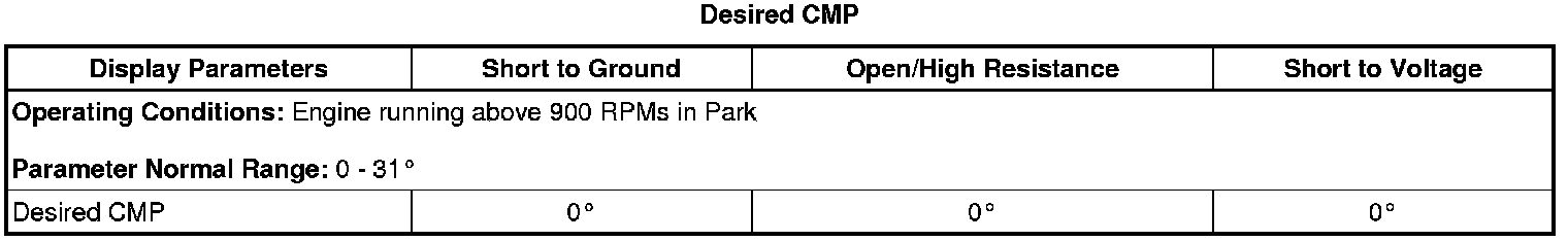 The camshaft position (CMP) actuator solenoid is controlled by the engine control module (ECM). The ECM sends a 12 volt, pulse width modulated (PWM) signal to the CMP actuator solenoid. The CMP actuator solenoid positions the CMP actuator spool valve to control the amount of pressurized engine oil, which enters into the CMP actuator assembly. A low reference wire circuit between the CMP actuator solenoid and the ECM completes the electrical circuit. The frequency of the pulse width modulated signal is fixed at 150 Hz. The ECM can only command the CMP actuator to retard the valve timing from the camshaft park position, or advance the valve timing back to the park position. The total range of valve timing command is 31 degrees as measured at the camshaft, or 62 degrees as measured at the crankshaft.