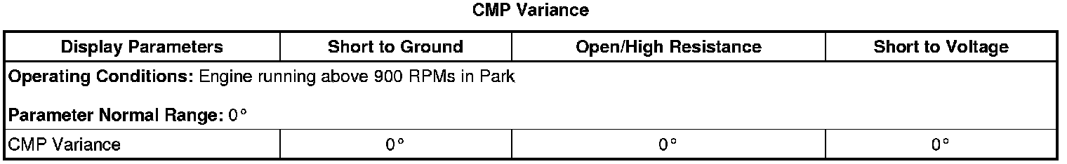 The ECM detects that the state of the high side driver and the state of the CMP solenoid control circuit does not match. The ECM will detect an open, high resistance, short to ground, or a short to voltage on the CMP solenoid control circuit, or an open on the low reference circuit, if the condition is present for more than 6.25 seconds.