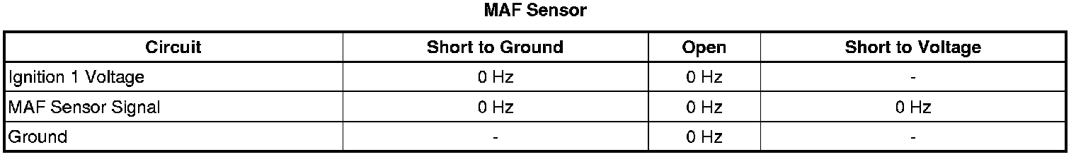 The ECM applies 5 volts to the MAF sensor on the MAF sensor signal circuit. The sensor uses the voltage to produce a frequency based on the inlet air flow through the sensor bore. The frequency varies within a range of near 1,700 Hertz at idle to near 9,500 Hertz at maximum engine load.