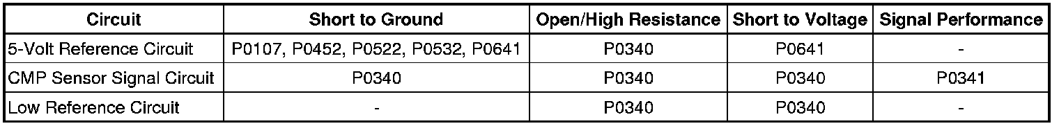 The 4X camshaft position (CMP) sensor circuits consist of an engine control module (ECM) supplied 5-volt reference circuit, low reference circuit, and an output signal circuit. The CMP sensor is an internally magnetic biased digital output integrated circuit sensing device. The sensor detects magnetic flux changes between the peaks and valleys of a 4-tooth reluctor wheel attached to the camshaft. As each reluctor wheel tooth rotates past the CMP sensor, the resulting change in the magnetic field is used by the sensor electronics to produce a digital output pulse. The sensor returns a digital ON/OFF DC voltage pulse of varying frequency, with two narrow, and two wide output pulses per camshaft revolution that represent an image of the camshaft reluctor wheel. The frequency of the CMP sensor output depends on the velocity of the camshaft. The ECM decodes the narrow and wide tooth pattern to identify camshaft position. This information is then used to sequence the ignition timing and fuel injection events for the engine. The ECM also uses CMP sensor output information to determine the camshaft relative position to the crankshaft, to control the CMP actuator if equipped, and for limp-home operation.