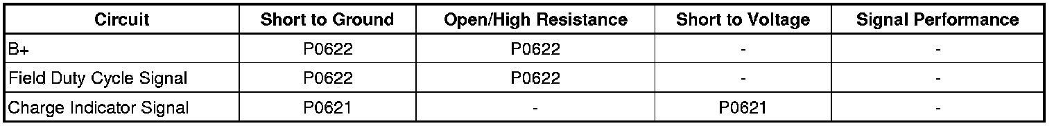 The engine control module (ECM) uses the charge indicator signal circuit, or L-terminal circuit, to control the power output of the generator, and to control the load of the generator on the engine. A high side driver in the ECM supplies voltage to the voltage regulator. This signals the voltage regulator to turn the field circuit ON and OFF. The ECM monitors the state of the charge indicator signal circuit. The ECM should detect low voltage on the charge indicator signal circuit when the ignition is ON and the engine is OFF, or if the generator malfunctions. When the engine is running, the ECM should detect high voltage on the charge indicator signal circuit.