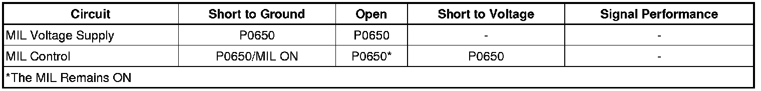The MIL informs the driver that an emission system fault has occurred and that the engine control system requires service. The engine control module (ECM) monitors the MIL control circuit for conditions that are incorrect for the commanded states of the MIL. For example, a failure condition exists if the ECM detects low voltage when the MIL is commanded OFF, or high voltage when the MIL is commanded ON.
