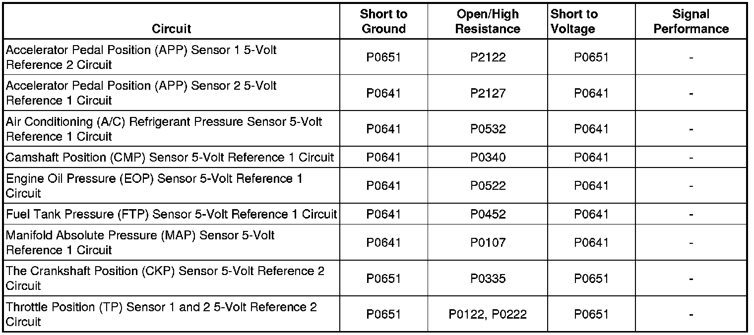 The engine control module (ECM) has 2 internal 5-volt reference busses called 5-volt reference 1 and 5-volt reference 2. Each reference bus provides 5-volt reference circuits for more than one sensor. Therefore, a fault condition on one 5-volt reference circuit will affect the other 5-volt reference circuits connected to that reference bus. The ECM monitors the voltage on the 5-volt reference busses.