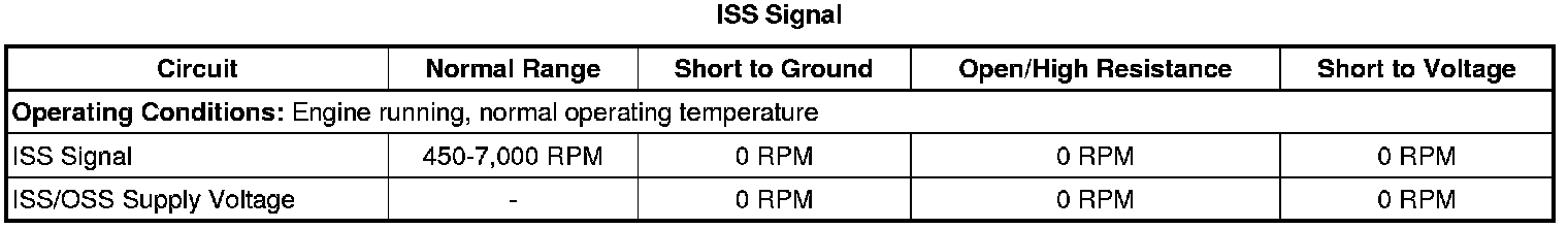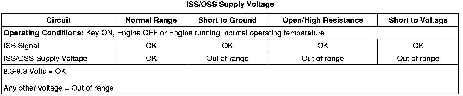 1. With the ignition ON, observe the transmission ISS/OSS supply voltage circuit status on the scan tool, the parameter should display OK. The ISS supply voltage should be 8.3-9.3 volts.