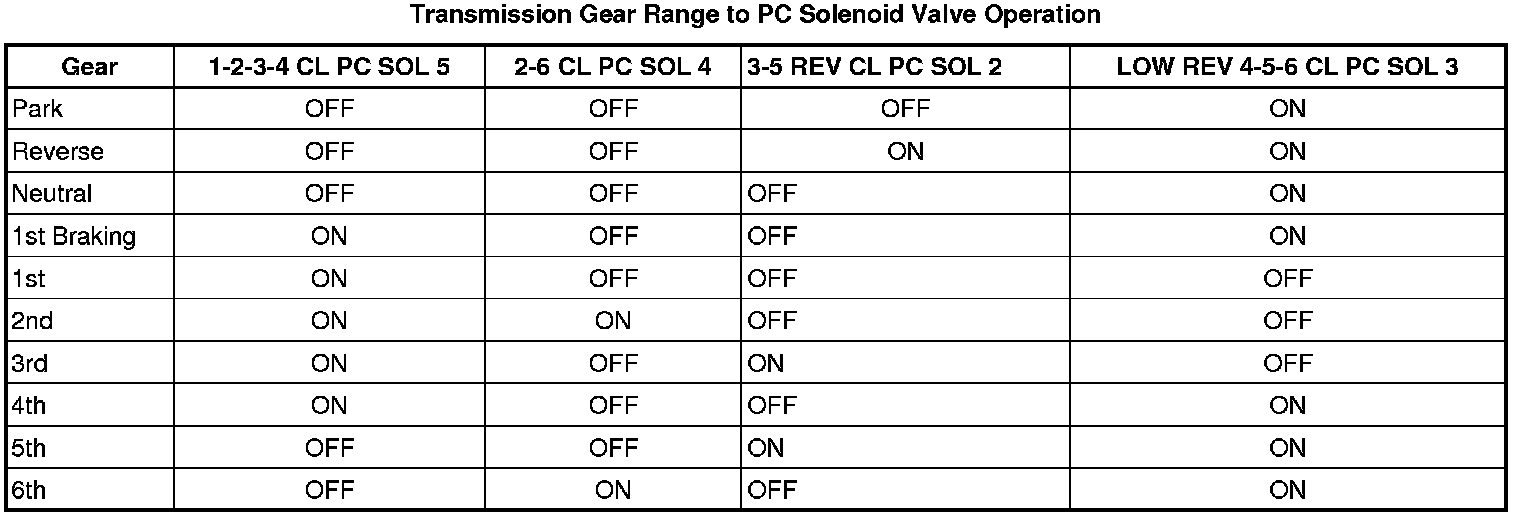 The clutch pressure control (PC) solenoid 3 is integral to the control solenoid (w/body and TCM) valve assembly and has no serviceable parts. The PC solenoid 3 is a normally high-pressure control solenoid which provides fluid pressure to the BR1 and 456 clutch regulator valve. The TCM controls the solenoid pressure by regulating the exhaust fluid. When the TCM commands the solenoid off, the exhausting fluid is stopped and the BR1 and 456 pressure is high. When commanded on, the clutch PC solenoid 3 regulates the amount of exhausting transmission fluid. Solenoid power is supplied by the TCM through a high side driver (HSD). The HSD protects the circuits and components that the TCM powers. Should the circuit overload the driver will shutdown. After the overload is removed the HSD reset.