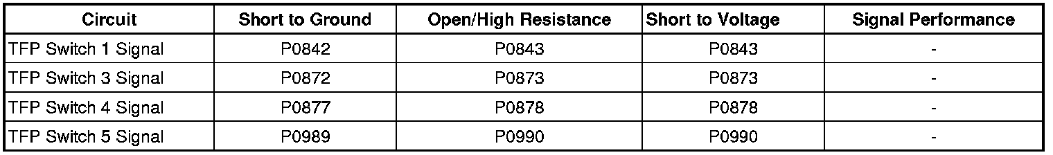 The transmission fluid pressure (TFP) switch 4 is part of the control solenoid (w/body and TCM) valve assembly and has no serviceable parts. The TCM supplies 12 volts to the TFP switch 4 on the TFP switch 4 signal circuit. The TFP switch 4 has an internal case ground. TFP switch 4 is normally closed, Low. When oil pressure is present at the TFP switch 4, the switch is open, high. The normally low clutch pressure control (PC) solenoid 4 controls the transmission fluid to the 1-2-3-4 clutch. The TCM monitors the normally closed TFP switch 4 signal circuit to determine the 1-2-3-4 clutch status.