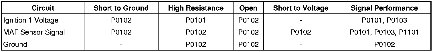 * A steady or intermittent high resistance of 15 ohms or greater on the ignition 1 voltage circuit will cause the MAF sensor signal to be increased by as much as 60 g/s. To pinpoint this condition perform a voltage drop test on the circuit.