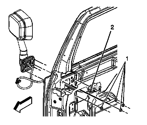 2. Install the fasteners (1) retaining the mirror to the door.