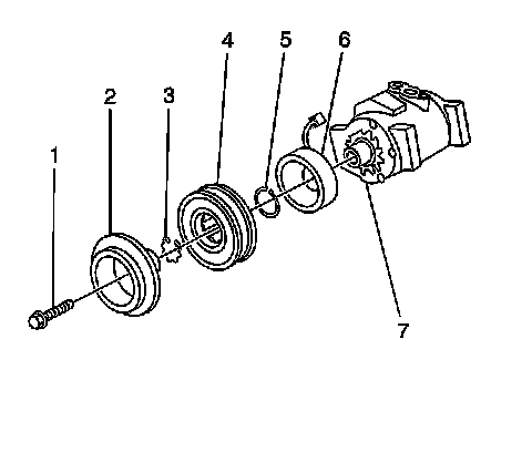 13. Remove the clutch coil (6) from the A/C compressor (7).