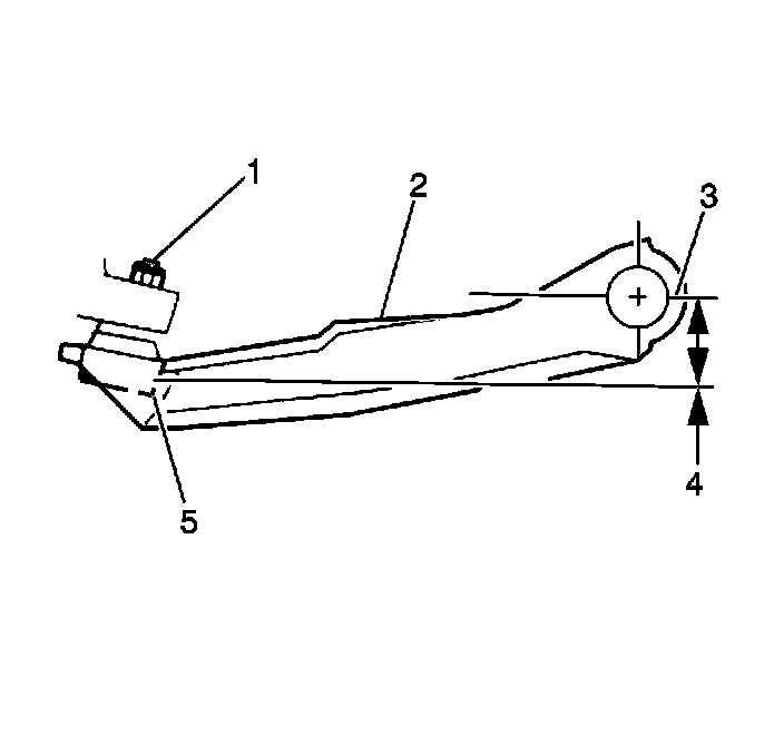 5. Measure from the pivot bolt center line (3) down to the lower corner (5) of the lower ball joint (1) in order to obtain the Z height measurement (4).