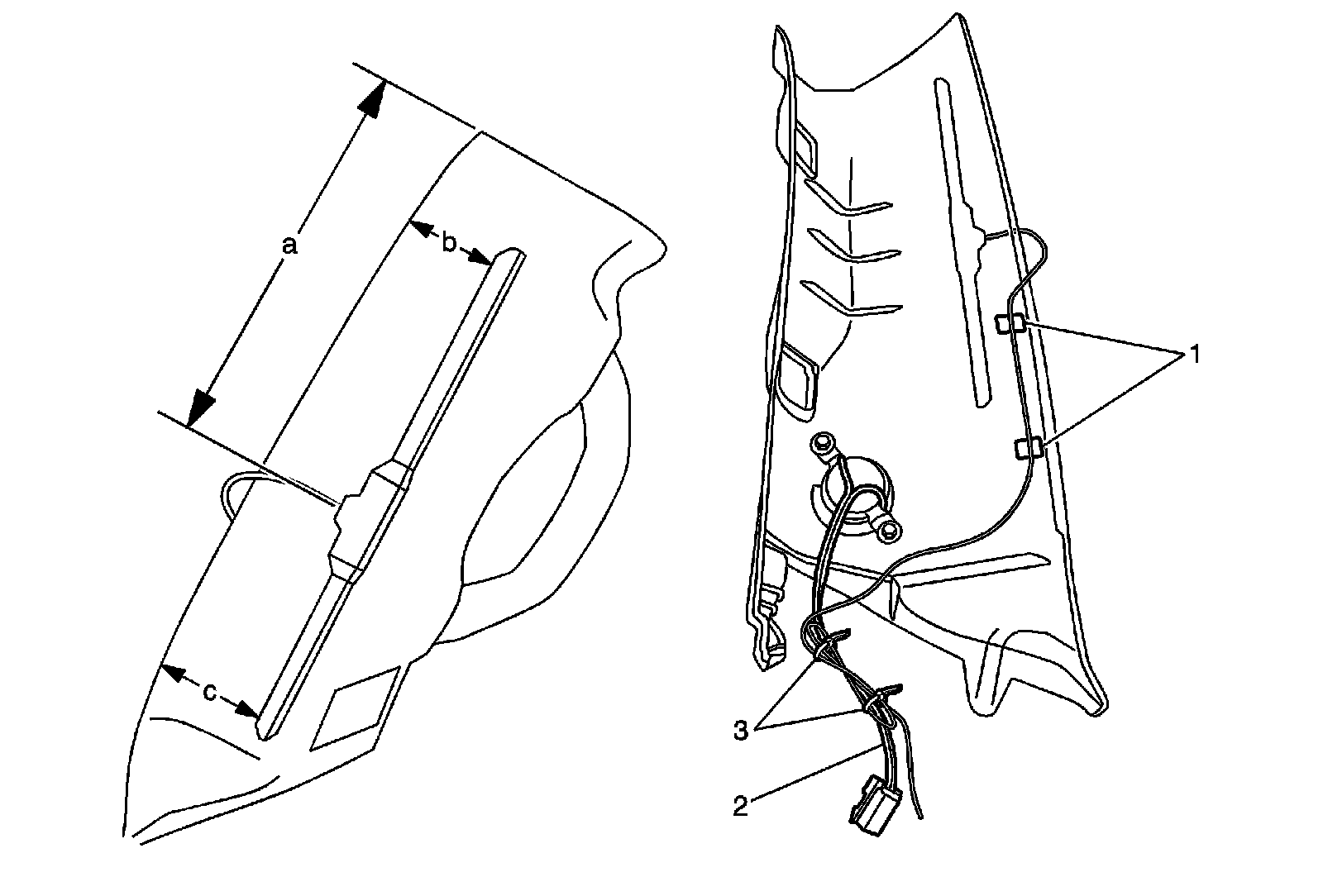 6. Apply Adhesion Promoter GM P/N 12378462 (Canadian P/N 10953554) to the molding in the areas where you will install the antenna and the antenna cable. Follow the Adhesion Promoter instructions on the product label. Use a=190 mm (7 1/2 in), b=67 mm (2 5/8 in), and c=88 mm (3 7/16 in) for the dimensions on the figure.