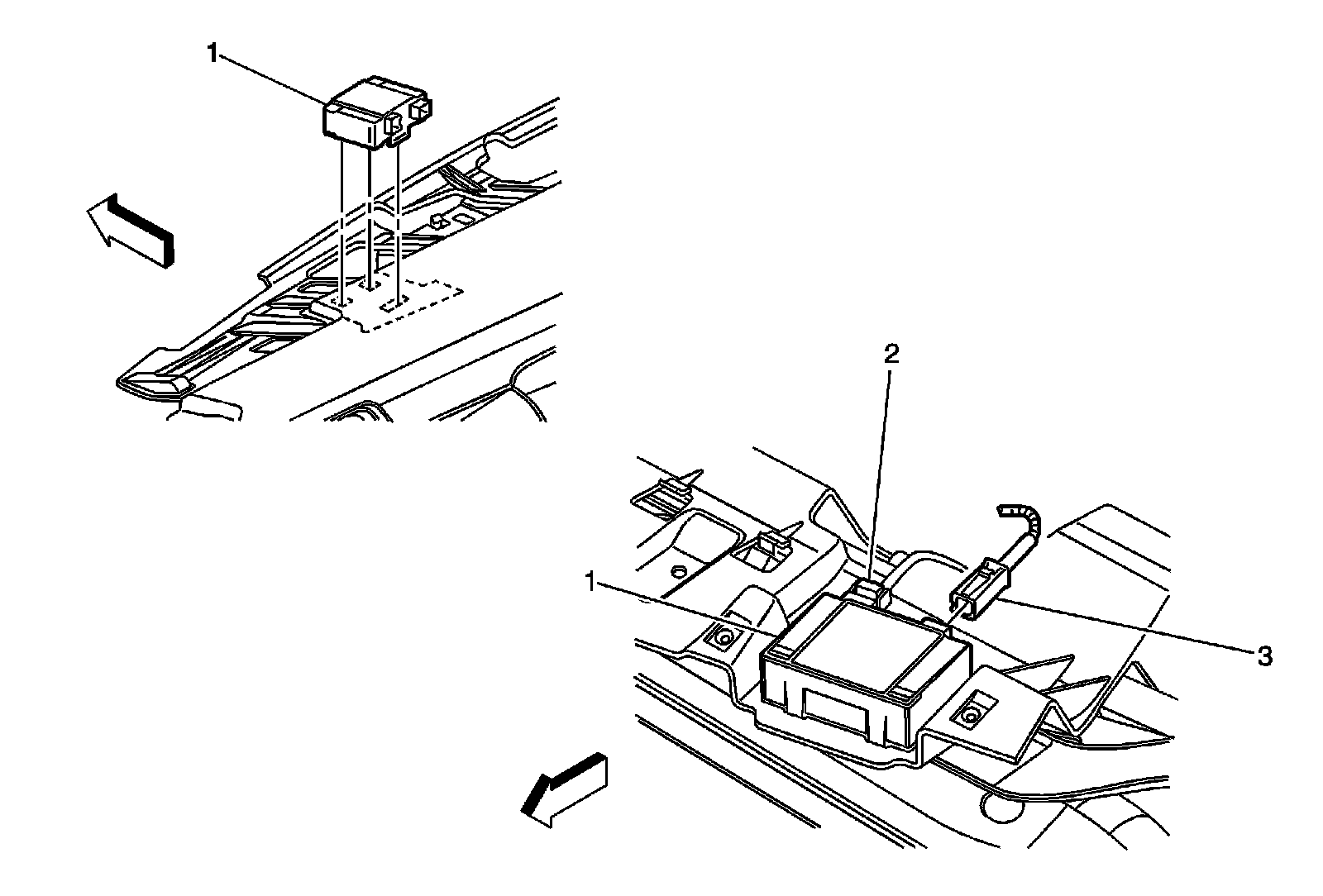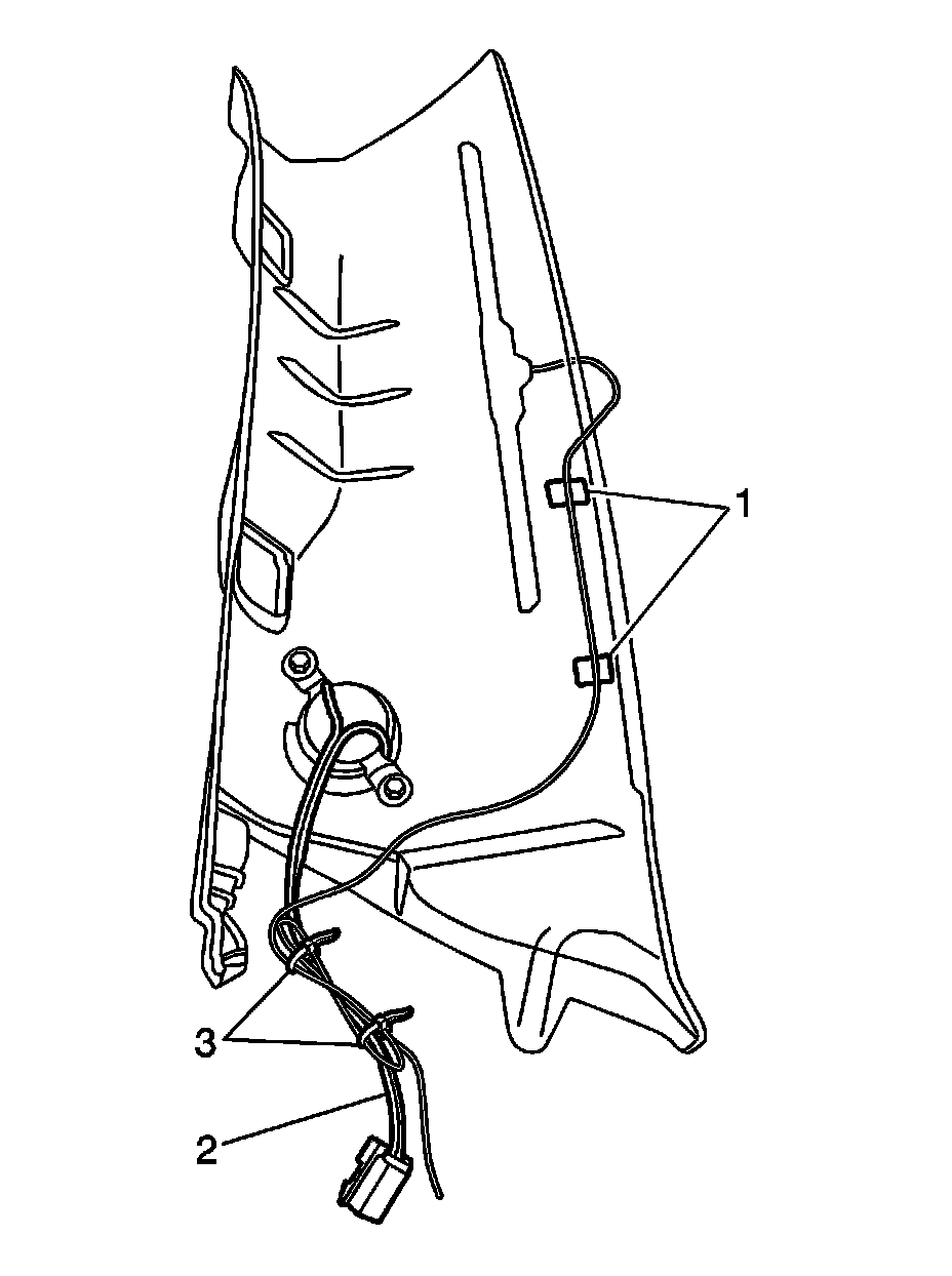 13. Route the antenna cable in front of the instrument panel (3) to the plenum (1) and secure along the plenum with four adhesive wire wraps (2).