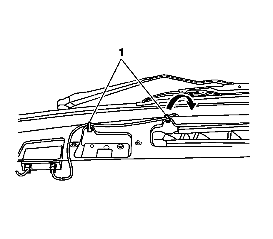 16. Wrap the antenna cable around the forward edge of the molding and taking out the slack, secure the cable to the back surface of the molding at the forward edge with two adhesive wire-wraps (1).